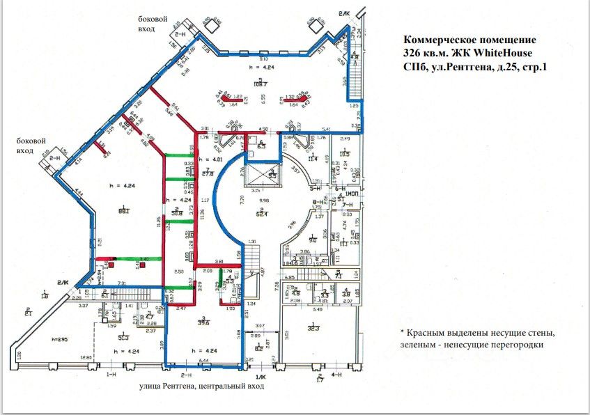 Коммерческое помещение имеет 3 входа, главный вход с панорамным остеклением с ул. Рентгена, два входа со двора. Объект оснащен системой видеонаблюдения с круглосуточной охраной.