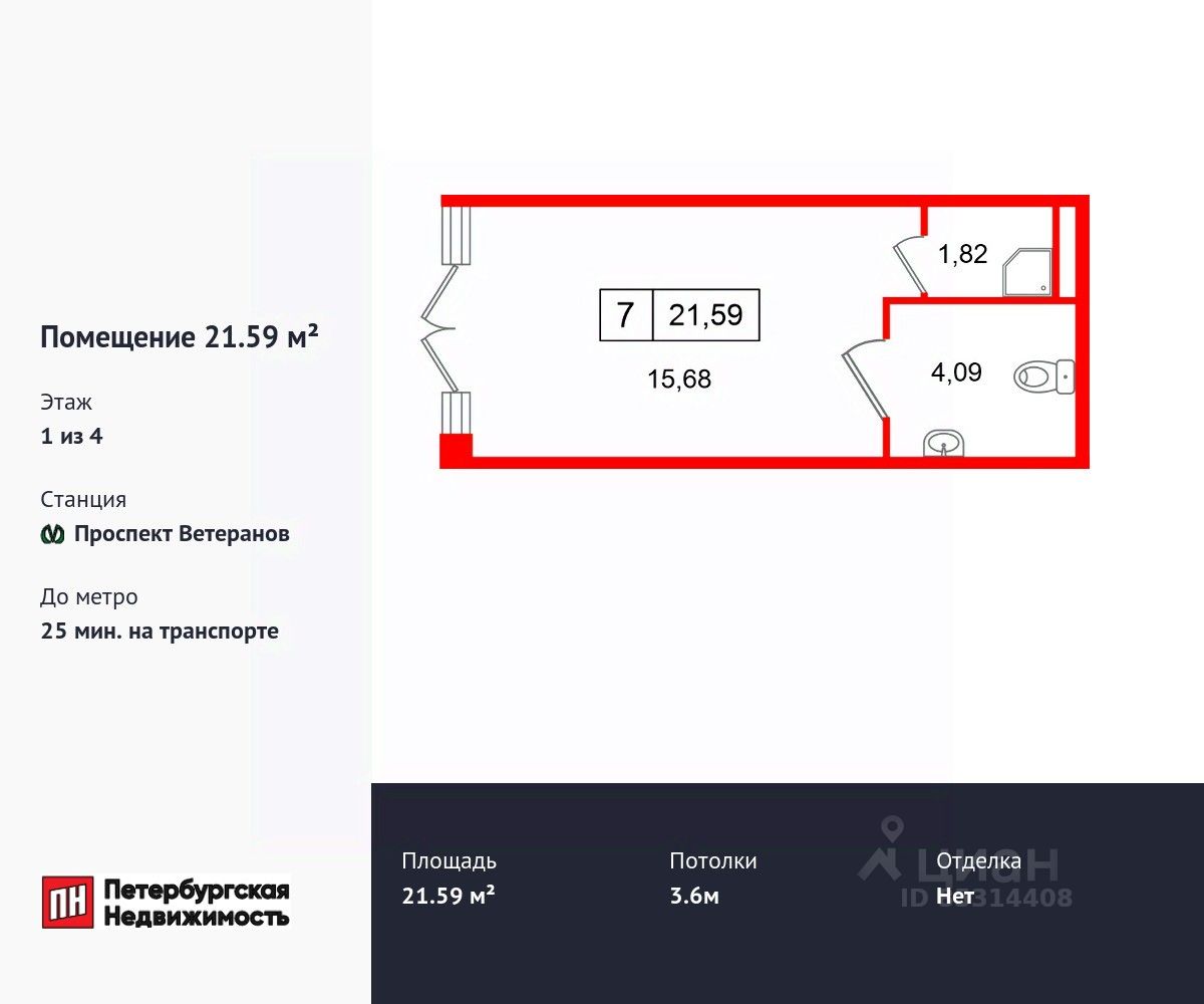 Продается помещение в ЖК ЖК "Дворцовый фасад площадью 21.59 м2. Помещение расположено рядом с метро Проспект Ветеранов. Расстояние до метро 25 Мин.на транспорте. Корпус сдается в 2026. Высота потолка 3.6 м. Без отделки.
