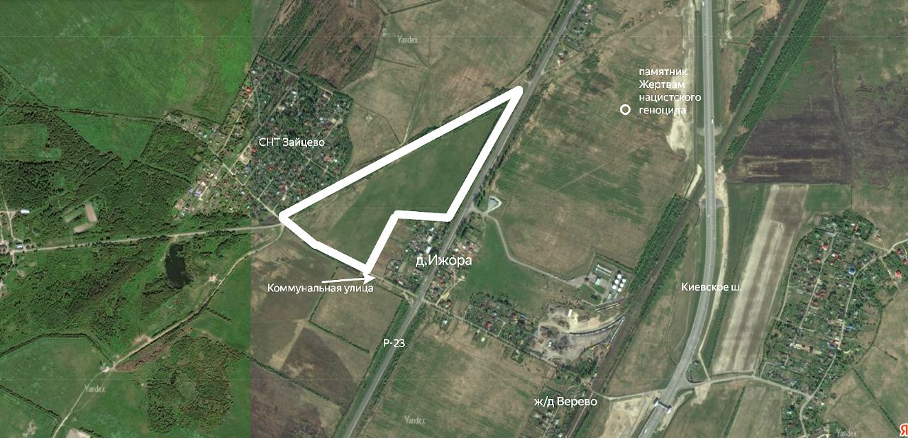 Первая линия Киевского шоссе (М3) вдоль трассы Р-23 (старое направление через Верево) на пересечении Коммунальной улицы. Включены в земли населенного пункта д. Ижора. Ориентир — напротив памятника Жертвам нацистского геноцида.