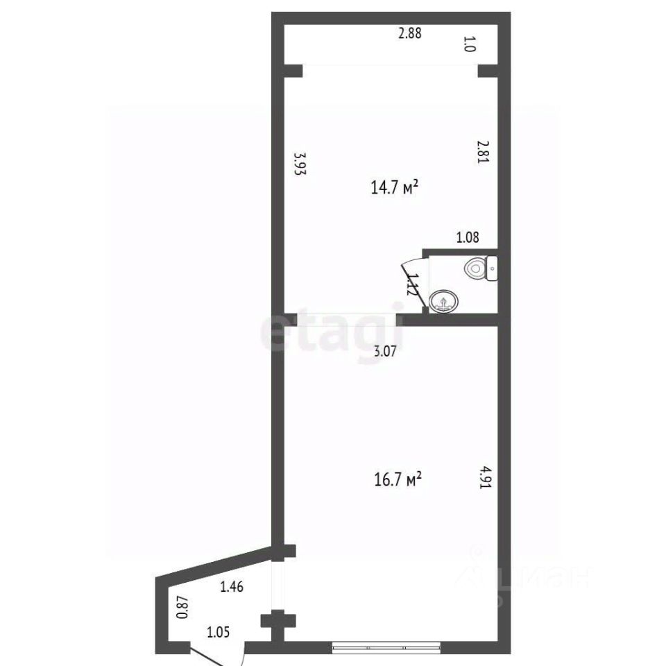 Площадь: 35 кв.м, высота потолков 2.6 м.
