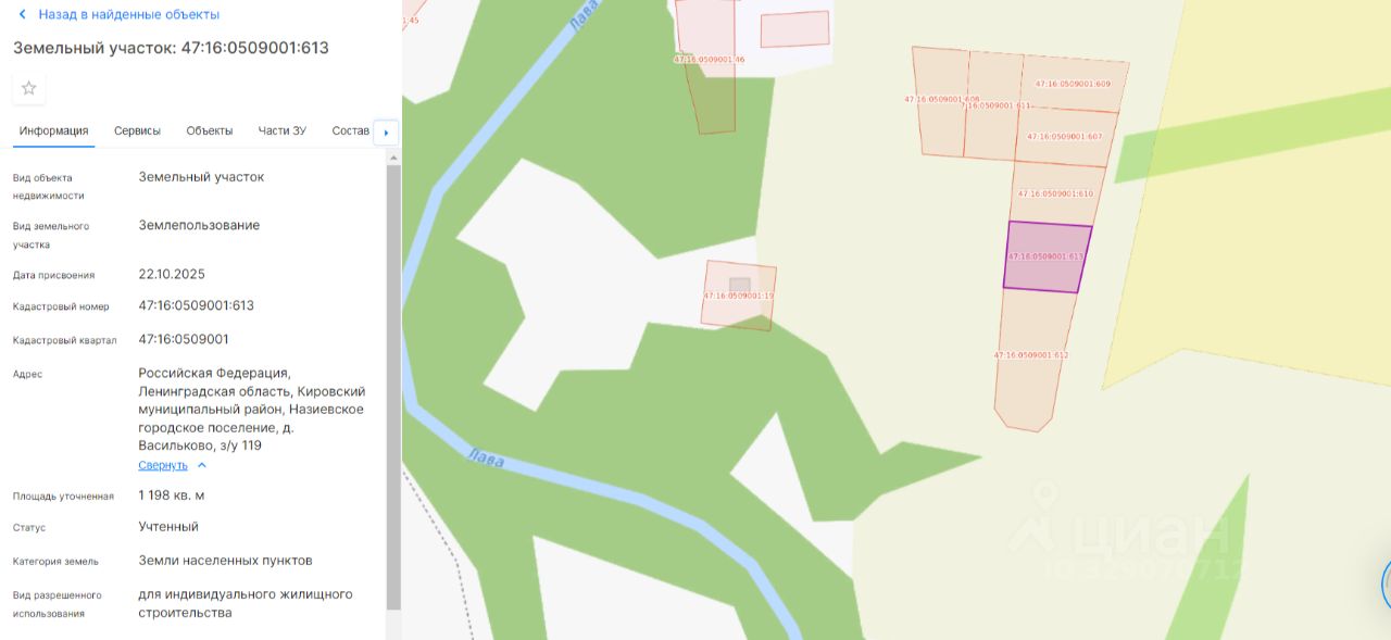 Площадью 1198 кв.м, кадастровый номер 47:16:0509001:613.