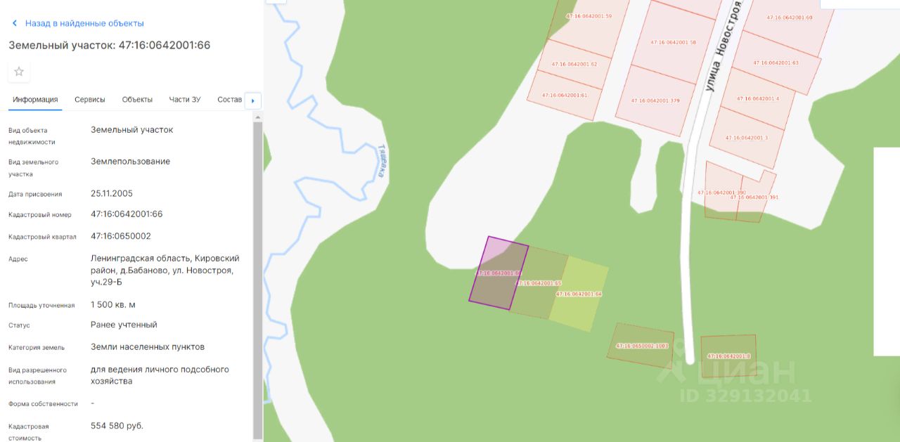 Площадь 1500 кв.м, кадастровый номер 47:16:0642001:66.