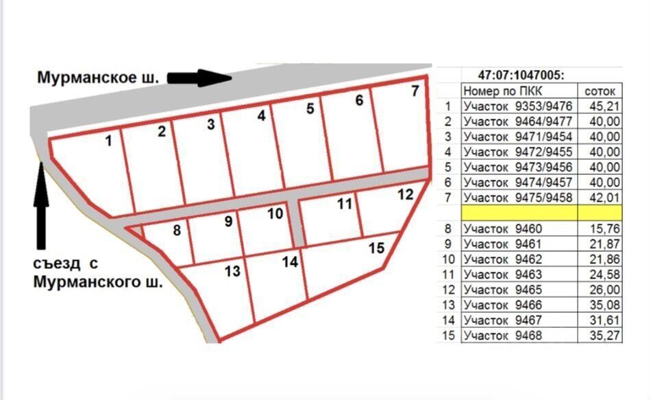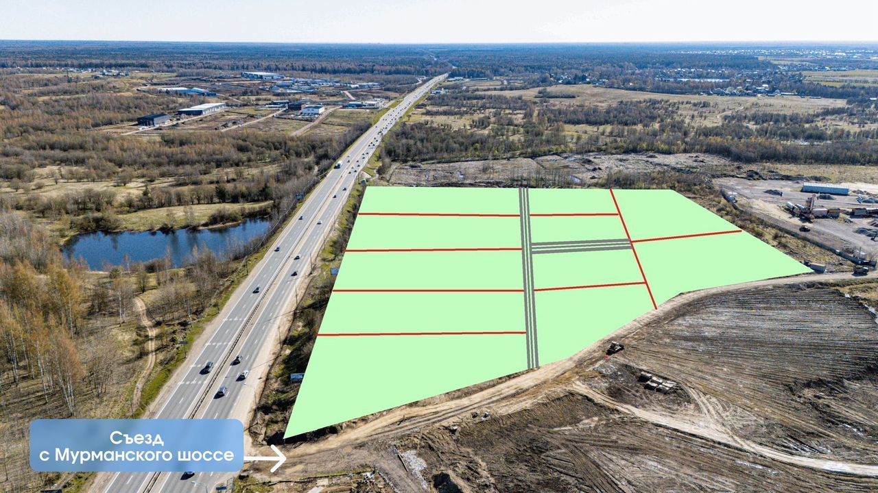 Съезд с Мурманского шоссе. Участки идеально просматриваются с трассы.