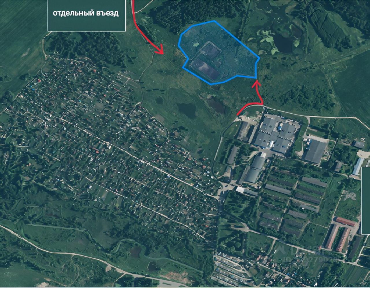 Ровный участок с двумя подъезными дорогами (одна дорога отдельная, другая дорога через промышленную зону).