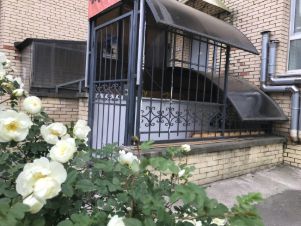 - На входе стеклопластиковая дверь с роллетами, запираемое кованое ограждение;