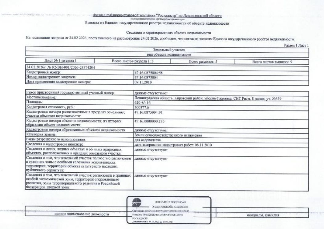 Лот7 Подвергнутое аресту Кировским РОСП по и/п 398225/2547028-ИП и принадлежащее должнику Администрация МО Мгинское г.п. Кировского муниципального района ЛО заложенное имущество: Земельный участок общ.пл.620 кв.м. кадастровый 47:16:0875004:58 и расположенное на нем нежилое здание общ.пл. 18,5 кв.м. кадастровый 47:16:0875004:94, расположенные по адресу: ЛО, Кировский район, Массив Славянка, СНТ Ритм, линия 8-я, уч. 359.