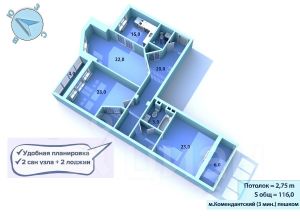 Наш объект - близость к метро (Комендантский проспект - 500 м), Юнтоловскому Заказнику, развитая сеть наземного транспорта, удобный выезд на ЗСД! Общая пл. 107 м, комнаты (23+23+20), кухня 16м. Ремонт евростандарт, консьерж, видеонаблюдение.