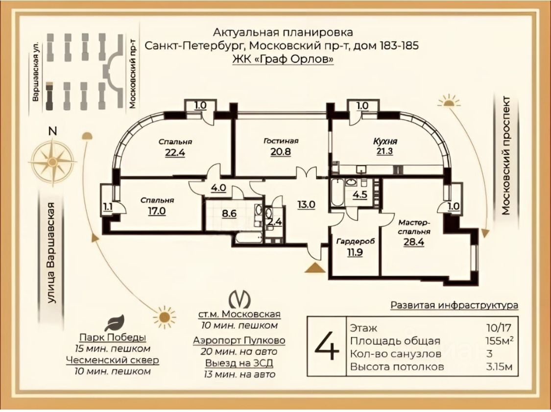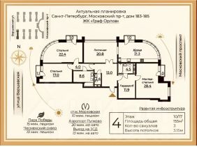 ЖК ГРАФ ОРЛОВ Московский проспект, 183-185, корпус 1 . Новый кирпично - монолитный дом бизнес класса , ВЫСОТА ПОТОЛКОВ 3,15, ВСЯ ЦЕНА В ДОГОВОРЕ, несущие конструкции сведены к минимуму, что расширяет возможности перепланировки. Светлая, видовая трехсторонняя квартира. 4 французских балкона, панорамные окна, 3 санузла, большая гардеробная и прихожая. Бесшумные скоростные зеркальные финские лифты из паркинга на этаж . Подземный паркинг. Отделка под чистовая . На уровне второго этажа есть выход на стилобат /закрытый двор /, на котором находятся зона отдыха и детская площадка. Отдельный вход в подъезд с первого и второго этажей. До метро "Московская " и Пулковского парка 5 минут пешком , до парка Победы - 10 минут, до парка Авиаторов - 10 минут. Престижный район, развитая инфраструктура, закрытая охраняемая домовая территория с контролем доступа. В шаговой доступности 7 школ, 2 лицея, 8 детских садов , 23 медицинских учреждения.