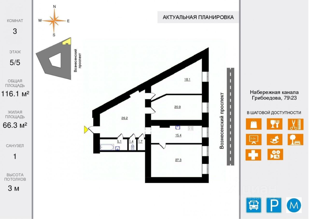 Арт. 24479856 У Вознесенского моста, на углу набережной канала Грибоедова и Вознесенского проспекта, выставлена на продажу уютная 3-комнатная квартира на пятом этаже.