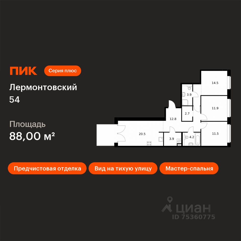 Продаётся 3-комн. квартира площадью 88 кв.м на 1 этаже 7 этажного дома (Корпус 1, Секция 1) проекта ПИК Лермонтовский 54. Светлый просторный подъезд на уровне земли, функциональная планировка, большие окна, предчистовая отделка.
