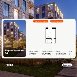 Продаётся квартира-студия площадью 24 кв.м на 2 этаже 7 этажного дома (Корпус 1, Секция 7) проекта ПИК Лермонтовский 54. Светлый просторный подъезд на уровне земли, функциональная планировка, большие окна, предчистовая отделка.
