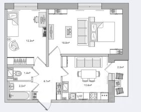 Общая площадь 54.20 кв.м., на 21 этаже. Комнаты 18.80 кв.м. и 12.30 кв.м., кухня 10.60 кв.м., раздельный санузел.