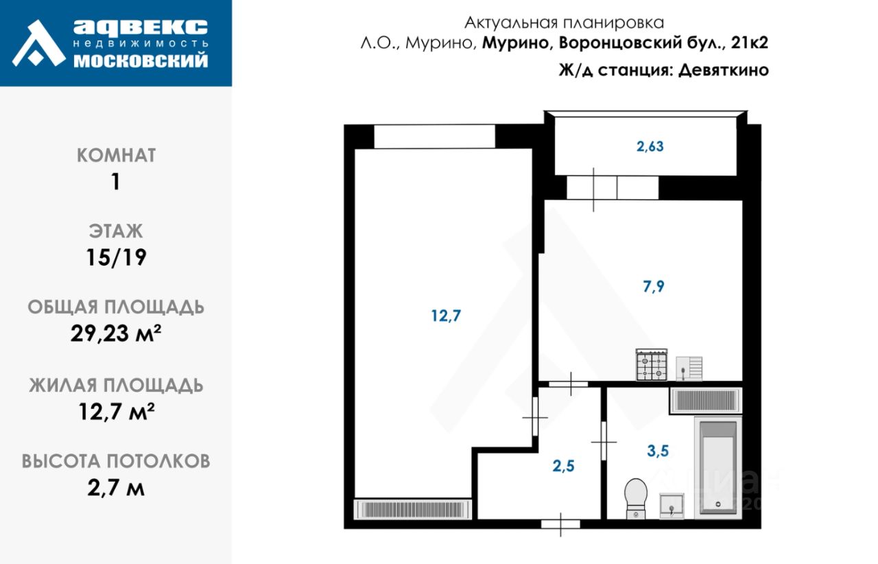 + Внимание, площадь квартиры без учета балкона = 26,6 кв.м., площадь балкона = 2.63 кв.м.;