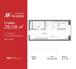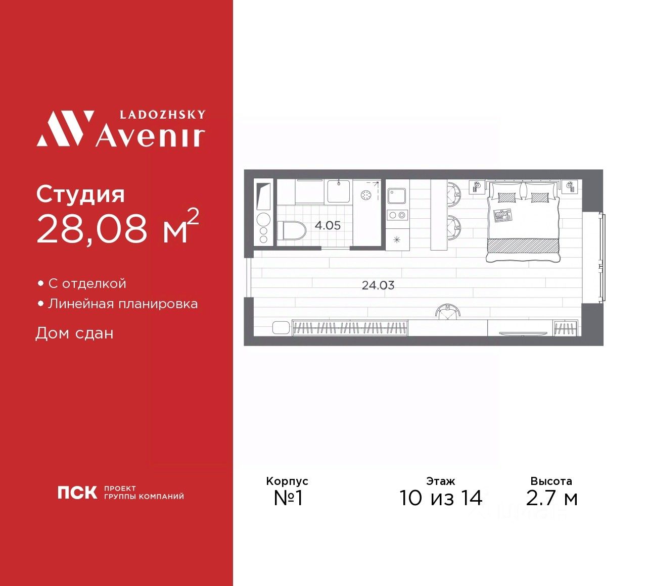 Однокомнатные апартаменты-студия от застройщика с отделкой в ЖК "Ladozhsky AVENIR" на 10 этаже. Общая площадь: 28.08 кв.м., площадь гостиной 24.03 кв.м., из которых 5 кв.м. выделено под кухонную зону. Все окна выходят на одну сторону. В апартаментах один совмещенный санузел. Высота потолков 2.7 м.