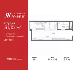 1-комн. апартаменты-студия от застройщика с отделкой в ЖК "Ladozhsky AVENIR" на 8 этаже. Общая площадь: 31.15 кв.м., площадь гостиной 27.1 кв.м., из которых 5 кв.м. выделено под кухонную зону. Все окна выходят на одну сторону. В апартаментах один совмещенный санузел. Высота потолков 2.7 м.