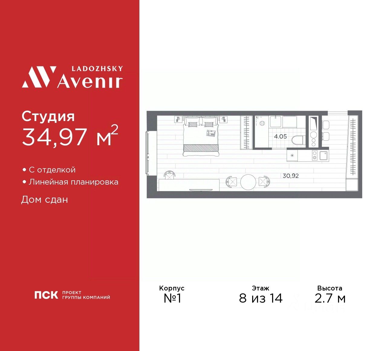 1-комн. апартаменты-студия с отделкой в ЖК "Ladozhsky AVENIR" на 8 этаже. Общая площадь: 34.97 кв.м., площадь гостиной 30.92 кв.м., из которых 5 кв.м. выделено под кухонную зону. Все окна выходят на одну сторону. В апартаментах один совмещенный санузел. Высота потолков 2.7 м.