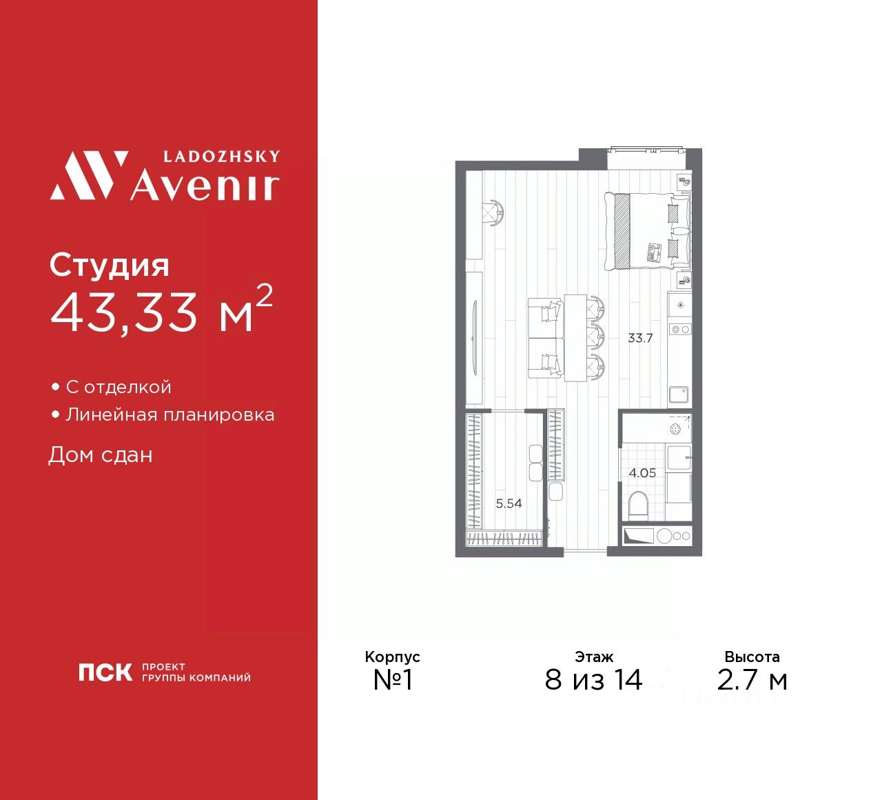 Продаются 1-комн. апартаменты-студия с отделкой в ЖК "Ladozhsky AVENIR" на 8 этаже. Общая площадь: 43.33 кв.м., площадь гостиной 33.7 кв.м., из которых 5 кв.м. выделено под кухонную зону. Все окна выходят на одну сторону. В апартаментах один совмещенный санузел. Высота потолков 2.7 м.