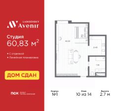 1-комн. апартаменты-студия от застройщика с отделкой в ЖК "Ladozhsky AVENIR" на 10 этаже. Общая площадь: 60.83 кв.м., площадь гостиной 53.45 кв.м., из которых 8.4 кв.м. выделено под кухонную зону. Все окна выходят на одну сторону. В апартаментах один совмещенный санузел. Высота потолков 2.7 м.