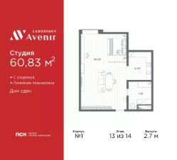 1-комн. апартаменты-студия от застройщика с отделкой в ЖК "Ladozhsky AVENIR" на 13 этаже. Общая площадь: 60.83 кв.м., площадь гостиной 53.45 кв.м., из которых 8.4 кв.м. выделено под кухонную зону. Все окна выходят на одну сторону. В апартаментах один совмещенный санузел. Высота потолков 2.7 м.
