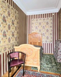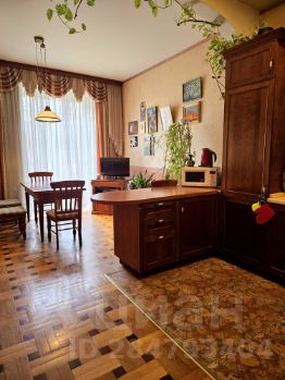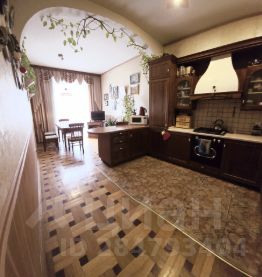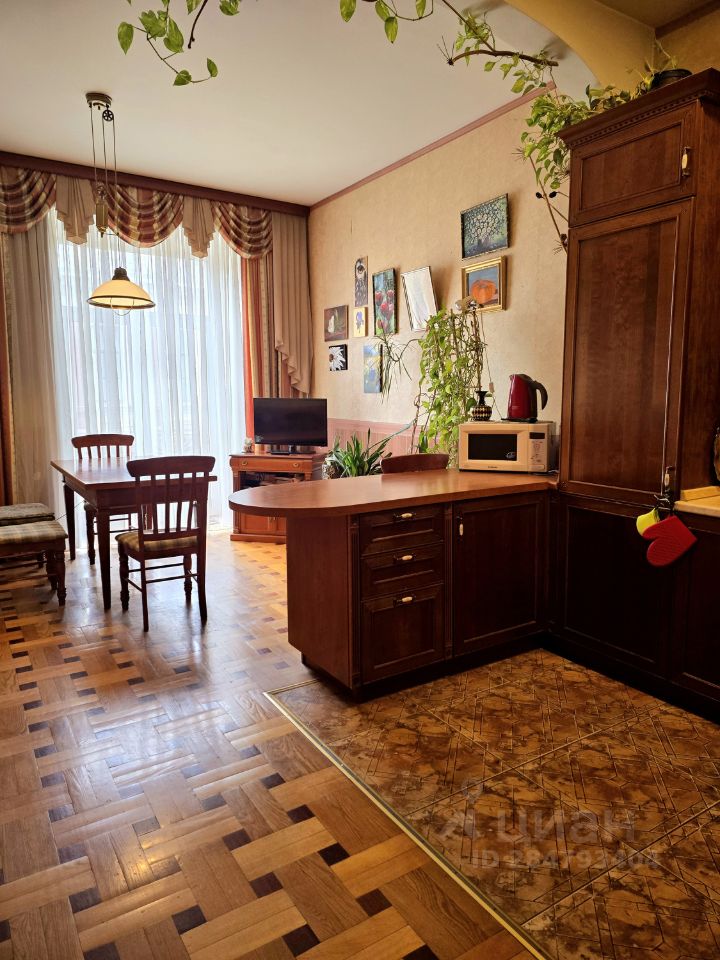Квартира находится на третьем этаже. Большая кухня-столовая с выходом на балкон, встроенной кухонной мебелью и бытовой техникой. В квартире уникальный паркет с элементами красного дерева, ванная комната с чугунной ванной, душевой кабиной, раковиной и биде, есть отдельный санузел с унитазом и раковиной. В зале есть действующая, в белом кафеле, печь.