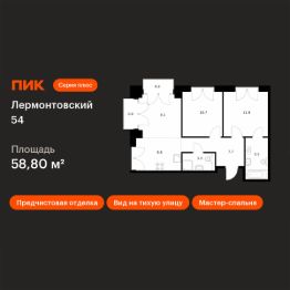 Продаётся 2-комн. квартира площадью 58,8 кв.м на 4 этаже 7 этажного дома (Корпус 1, Секция 7) проекта ПИК Лермонтовский 54. Светлый просторный подъезд на уровне земли, функциональная планировка, большие окна, предчистовая отделка.