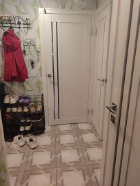 В прихожей, на кухонном полу и кухонном фартуке кафель. Есть огромная кладовка.