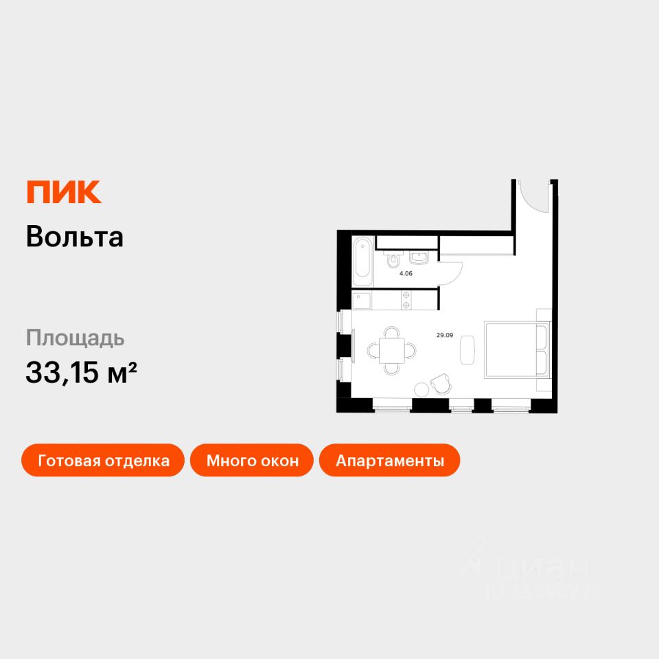 Продаются апартаменты-студия площадью 33,15 кв.м на 2 этаже 15 этажного дома (Вольта, Секция 1) проекта ПИК Вольта.