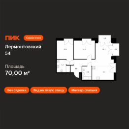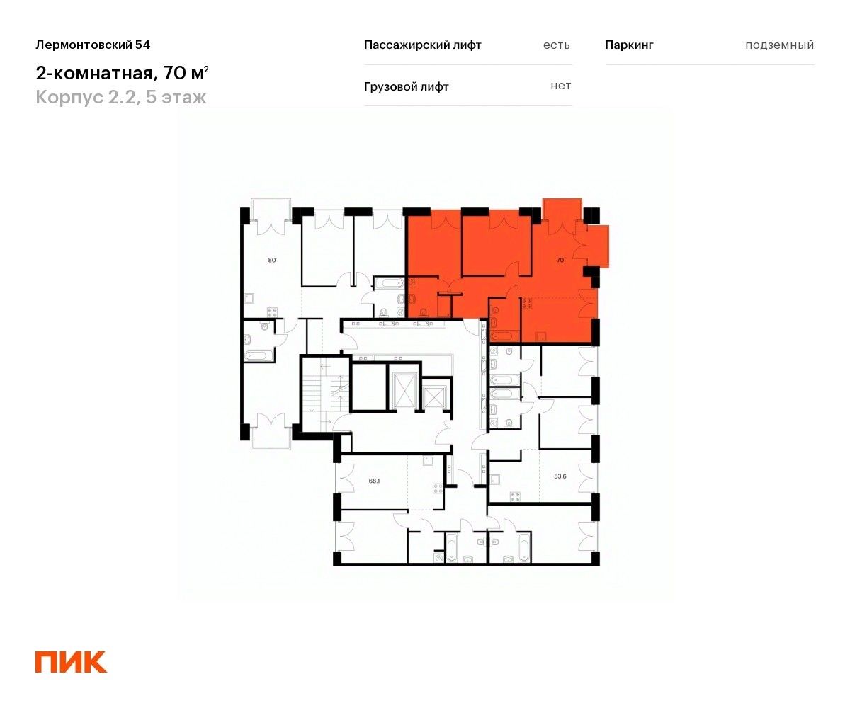 Продаётся 2-комн. квартира площадью 70 кв.м на 5 этаже 9 этажного дома (Корпус 2.2, Секция 12) проекта ПИК Лермонтовский 54. Светлый просторный подъезд на уровне земли, функциональная планировка, большие окна, без отделки.