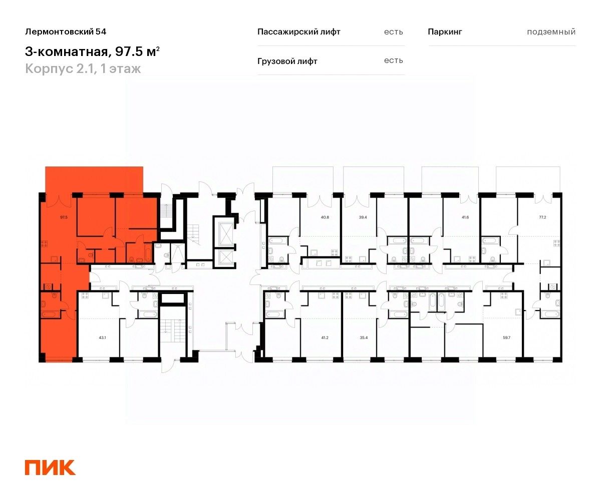 Продаётся 3-комн. квартира площадью 97,5 кв.м на 1 этаже 9 этажного дома (Корпус 2.1, Секция 2) проекта ПИК Лермонтовский 54. Светлый просторный подъезд на уровне земли, функциональная планировка, большие окна, без отделки.