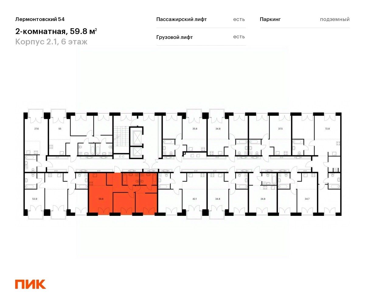 Продаётся 2-комн. квартира площадью 59,8 кв.м на 6 этаже 9 этажного дома (Корпус 2.1, Секция 2) проекта ПИК Лермонтовский 54. Светлый просторный подъезд на уровне земли, функциональная планировка, большие окна, без отделки.