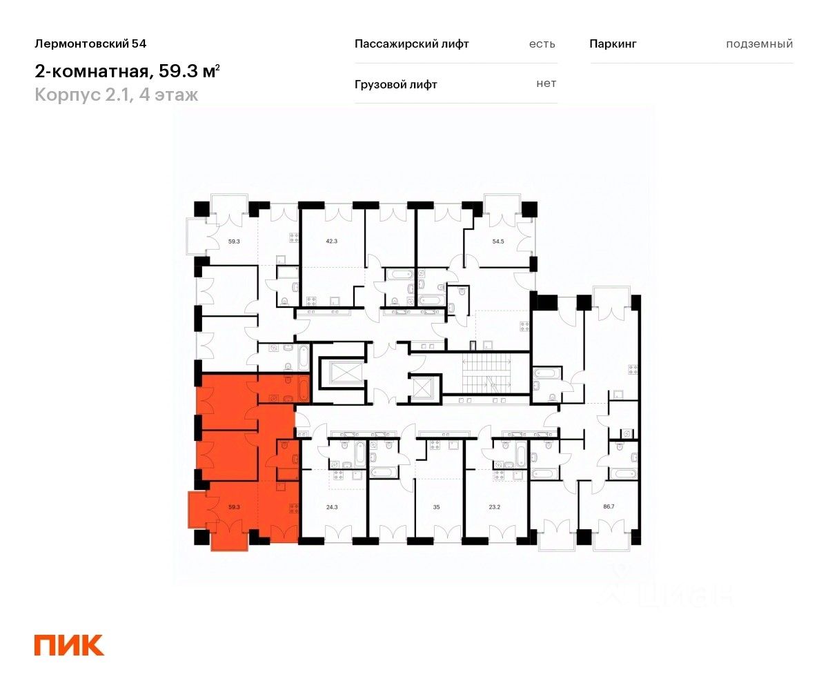 Продаётся 2-комн. квартира площадью 59,3 кв.м на 4 этаже 7 этажного дома (Корпус 2.1, Секция 7) проекта ПИК Лермонтовский 54. Светлый просторный подъезд на уровне земли, функциональная планировка, большие окна, без отделки.