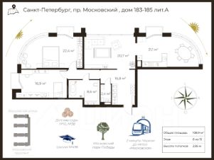 Квартира общей площадью 108,9м² расположена на 8 этаже 14 этажного дома и ориентирована на 3 стороны. Благодаря широкоформатному остеклению из квартиры открывается завораживающий вид на Варшавскую улицу.