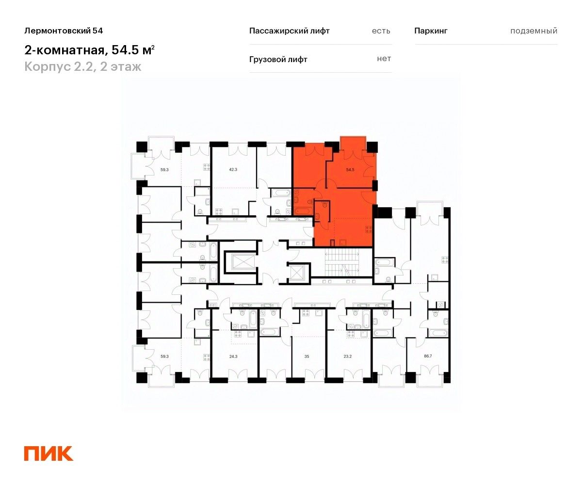 Продаётся 2-комн. квартира площадью 54,5 кв.м на 2 этаже 7 этажного дома (Корпус 2.2, Секция 14) проекта ПИК Лермонтовский 54. Светлый просторный подъезд на уровне земли, функциональная планировка, большие окна, без отделки.