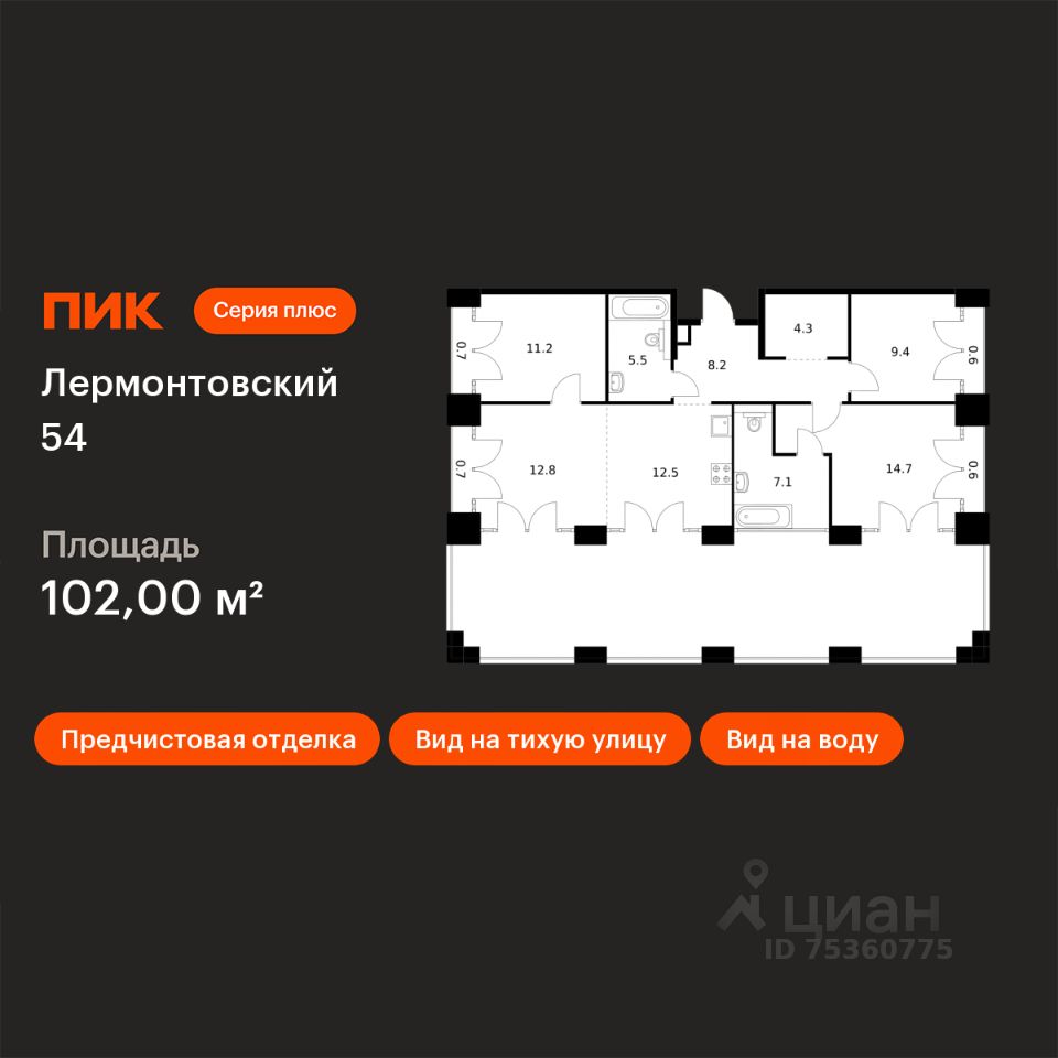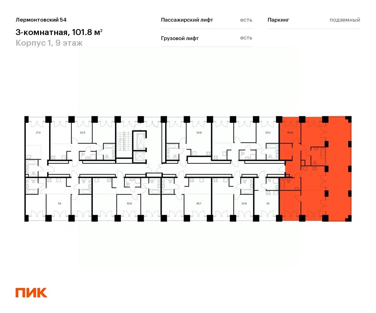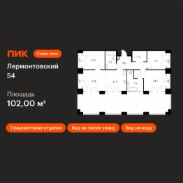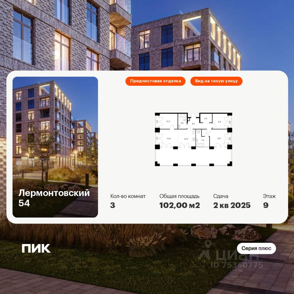 Продаётся 3-комн. квартира площадью 102 кв.м на 9 этаже 9 этажного дома (Корпус 1, Секция 2) проекта ПИК Лермонтовский 54. Светлый просторный подъезд на уровне земли, функциональная планировка, большие окна, предчистовая отделка.