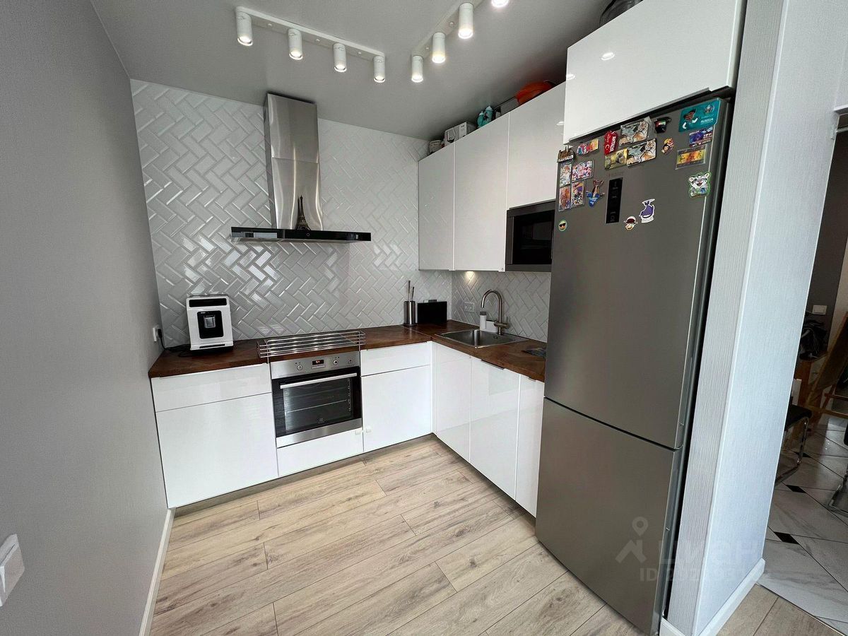 Новому владельцу остается встроенная кухня Икеа с натуральной деревянной столешницей, встроенная техника Еlectrolux, холодильник Haer.