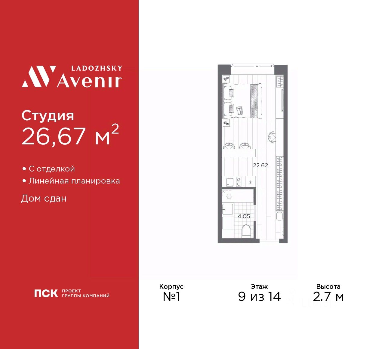 1-комн. апартаменты-студия с отделкой в ЖК "Ladozhsky AVENIR" на 9 этаже. Общая площадь: 26.67 кв.м., площадь гостиной 22.62 кв.м., из которых 5 кв.м. выделено под кухонную зону. Все окна выходят на одну сторону. В апартаментах один совмещенный санузел. Высота потолков 2.7 м.