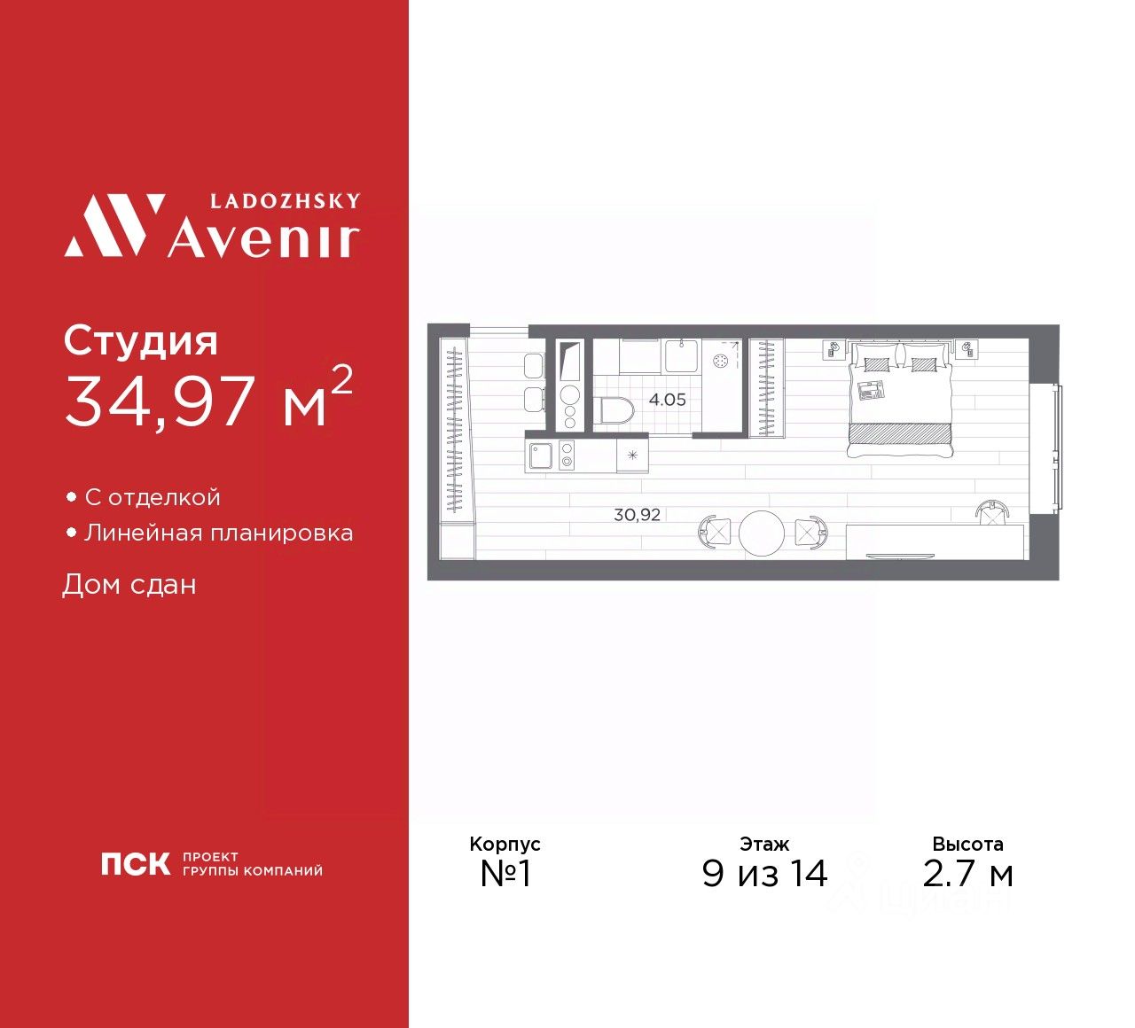 Продаются однокомнатные апартаменты-студия с отделкой в ЖК "Ladozhsky AVENIR" на 9 этаже. Общая площадь: 34.97 кв.м., площадь гостиной 30.92 кв.м., из которых 5 кв.м. выделено под кухонную зону. Все окна выходят на одну сторону. В апартаментах один совмещенный санузел. Высота потолков 2.7 м.
