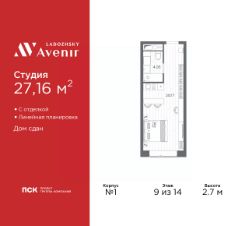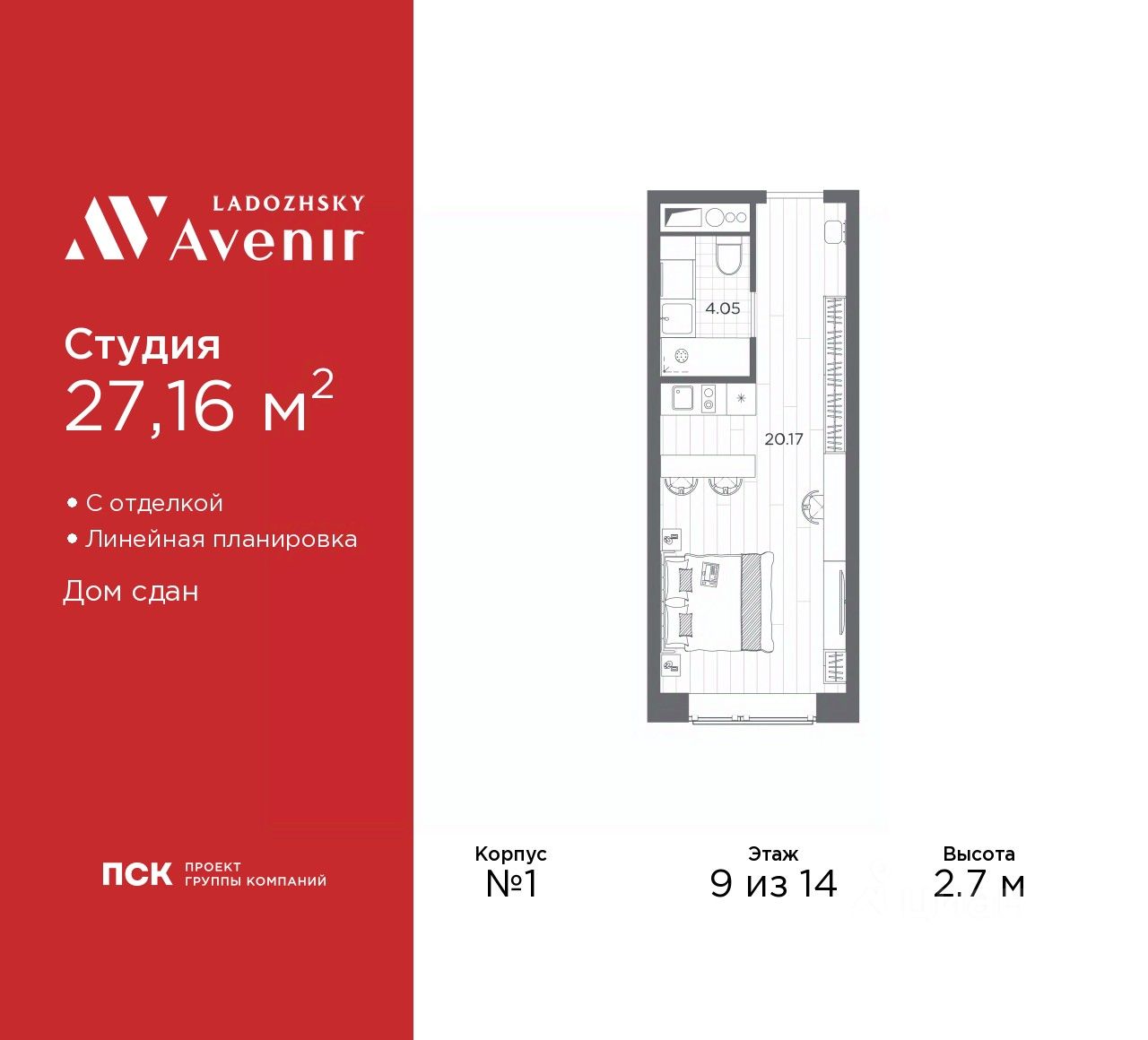 Продаются однокомнатные апартаменты-студия с отделкой в ЖК "Ladozhsky AVENIR" на 9 этаже. Общая площадь: 27.16 кв.м., площадь гостиной 23.11 кв.м., из которых 5 кв.м. выделено под кухонную зону. Все окна выходят на одну сторону. В апартаментах один совмещенный санузел. Высота потолков 2.7 м.
