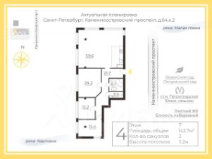 3 спальни! Просторная квартира с изолированной планировкой, общая площадь 143,7 кв.м. Кухня-гостиная 60 кв.м с панорамным остеклением смотрит на три стороны света, два санузла, три изолированные комнаты с большими окнами. Высокий 7-й этаж, потолки 3.10 метра. В квартире выполнен современный ремонт.