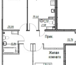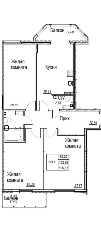 Квартира площадью 103 м2 + балкон 6м2+лоджия 5 м2. Кухня-гостиная 20 м2, раздельные комнаты 20м2+20м2+22м2, два отдельных с/у и отсутствие перегородок позволяет при ремонте обустроить идеальную планировку на свой вкус.
