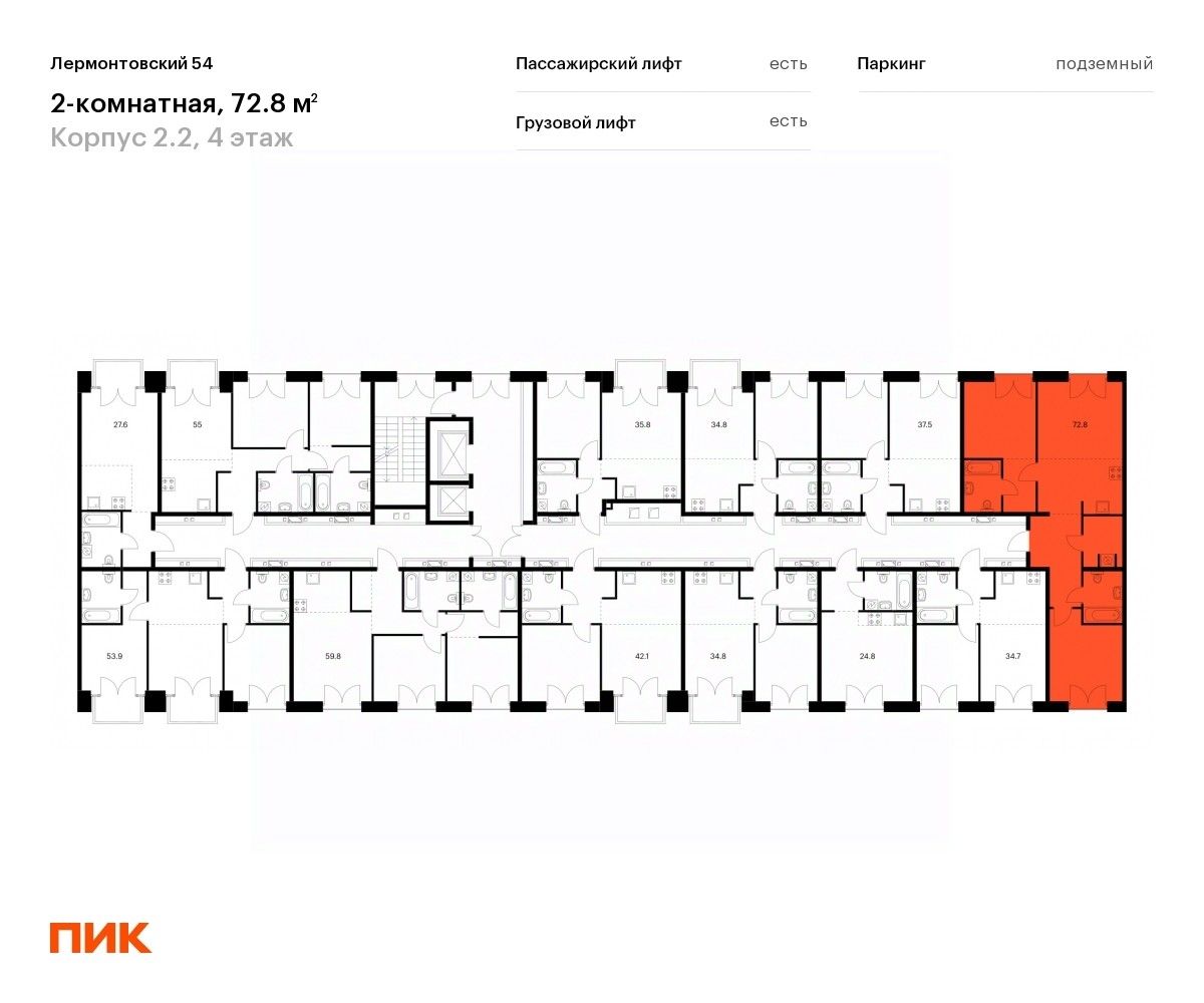 Продаётся 2-комн. квартира площадью 72,8 кв.м на 4 этаже 9 этажного дома (Корпус 2.2, Секция 9) проекта ПИК Лермонтовский 54. Светлый просторный подъезд на уровне земли, функциональная планировка, большие окна, без отделки.