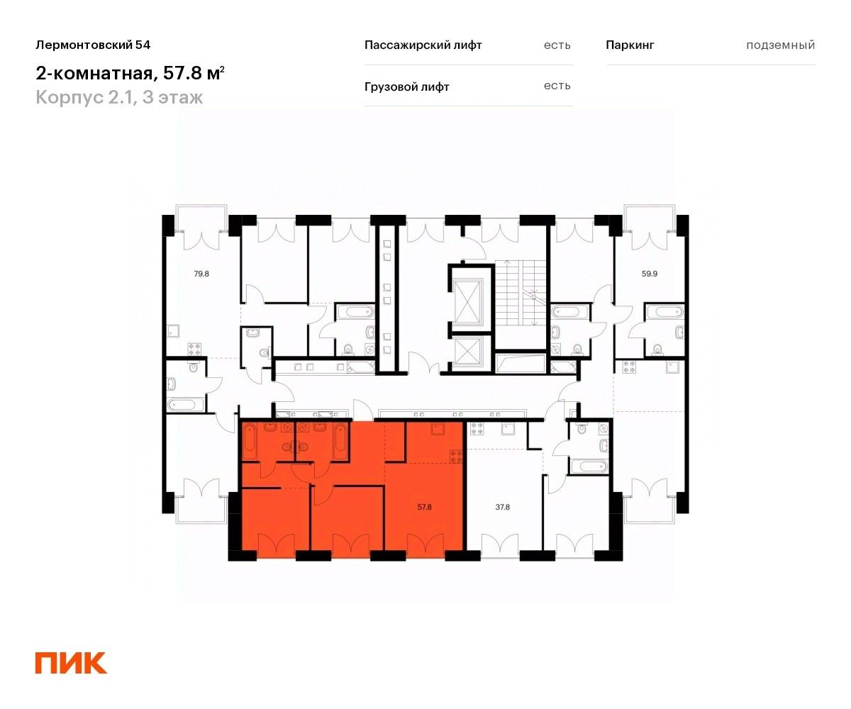 Продаётся 2-комн. квартира площадью 57,8 кв.м на 3 этаже 9 этажного дома (Корпус 2.1, Секция 4) проекта ПИК Лермонтовский 54. Светлый просторный подъезд на уровне земли, функциональная планировка, большие окна, без отделки.