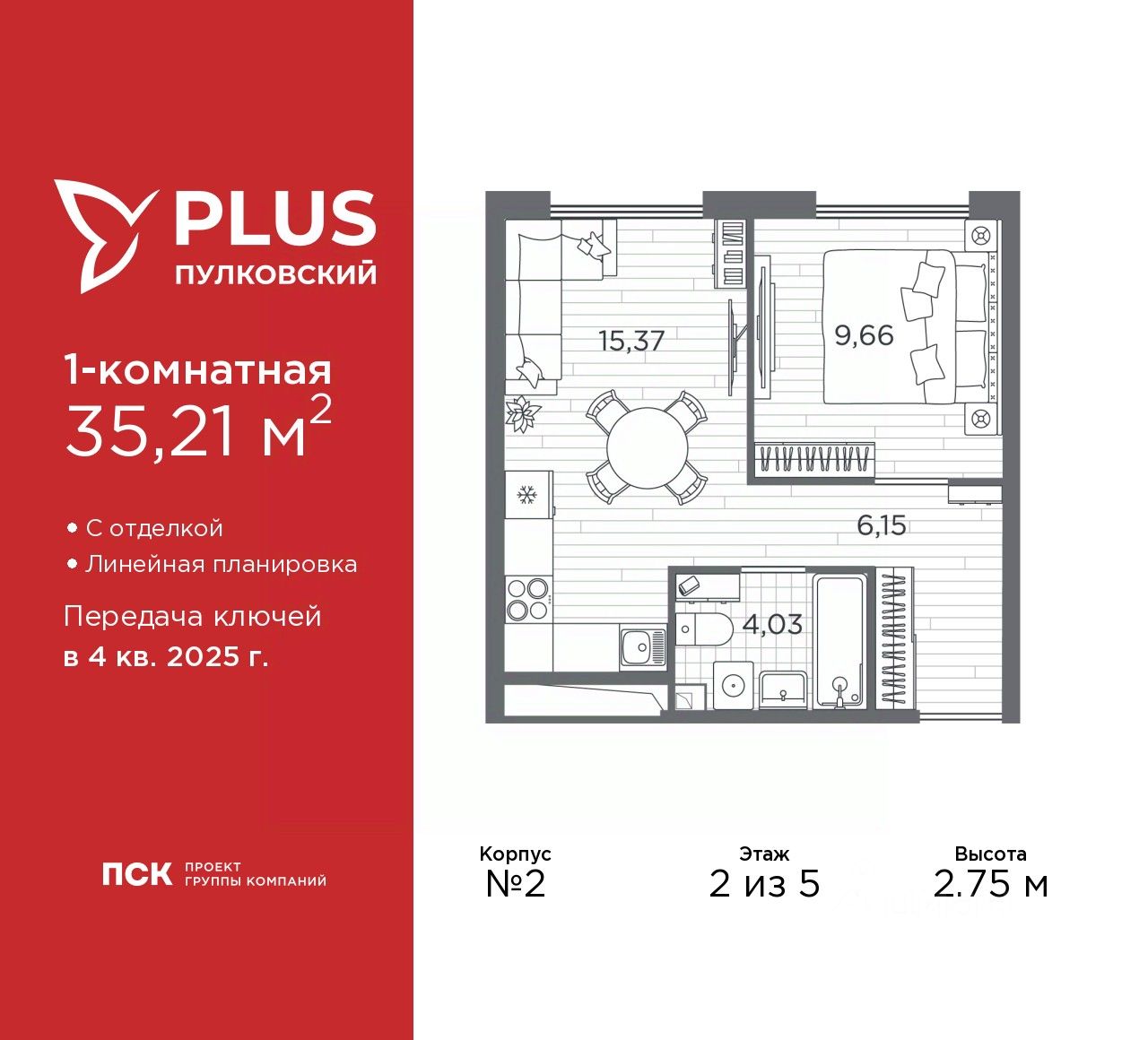 Продается 1-комн. квартира с отделкой в ЖК "PLUS Пулковский" на 2 этаже. Общая площадь: 35.21 кв.м., жилая: 9.66 кв.м., площадь просторной кухни-столовой: 15.37 кв.м. Все окна выходят на одну сторону. В квартире один совмещенный санузел. Высота потолков 2.75 м.