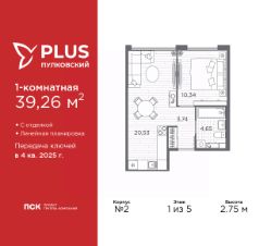 1-комн. квартира от застройщика с отделкой в ЖК "PLUS Пулковский" на 1 этаже. Общая площадь: 39.26 кв.м., жилая: 10.34 кв.м., площадь просторной кухни-столовой: 20.53 кв.м. Все окна выходят на одну сторону. В квартире один совмещенный санузел. Высота потолков 2.75 м.