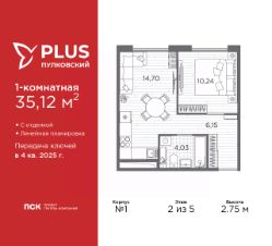 Просторная 1-комн. квартира с отделкой в ЖК "PLUS Пулковский" на 2 этаже. Общая площадь: 35.12 кв.м., жилая: 10.24 кв.м., площадь просторной кухни-столовой: 14.7 кв.м. Все окна выходят на одну сторону. В квартире один совмещенный санузел. Высота потолков 2.75 м.