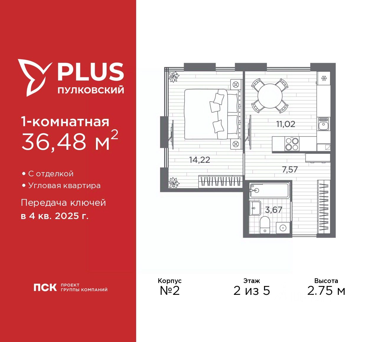 Продается однокомнатная квартира с отделкой в ЖК "PLUS Пулковский" на 2 этаже. Общая площадь: 36.48 кв.м., жилая: 14.22 кв.м., площадь просторной кухни-столовой: 11.02 кв.м. Квартира угловая, окна oбecпeчивaют paвнoмepнoe ocвeщeниe в тeчeниe дня. В квартире один совмещенный санузел. Высота потолков 2.75 м.