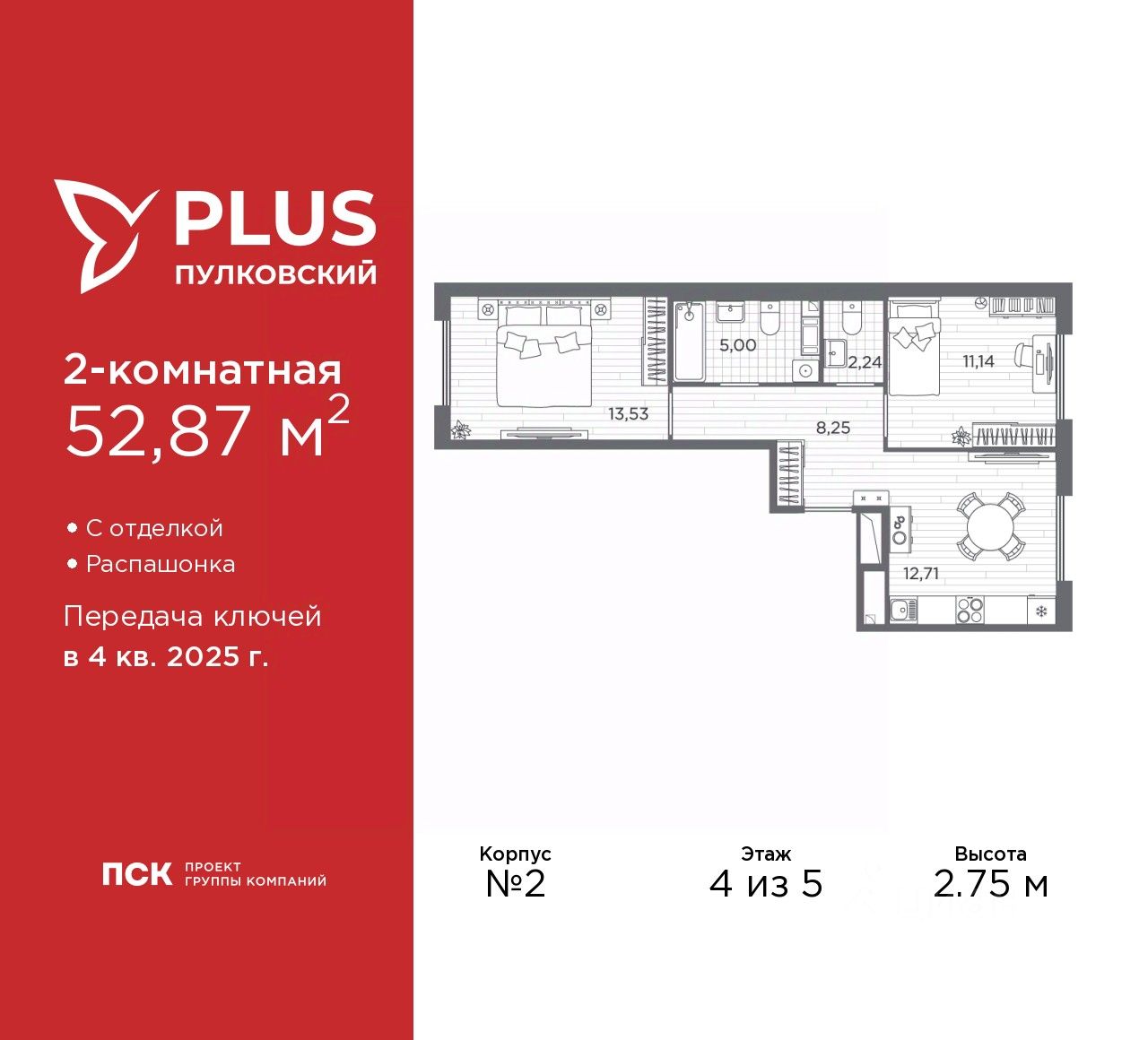2-комн. квартира с отделкой в ЖК "PLUS Пулковский" на 4 этаже. Общая площадь: 52.87 кв.м., жилая: 24.67 кв.м., площадь просторной кухни-столовой: 12.71 кв.м. Квартира - распашонка, без проходных комнат, окна выходят на paзные стороны дома. В квартире один совмещенный и один раздельный санузел. Высота потолков 2.75 м.