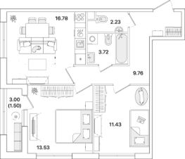 Квартира находится в 12 этажном доме, в Академик Жилой дом 2 на 1 этаже. Общая площадь квартиры 58,95 кв.м.