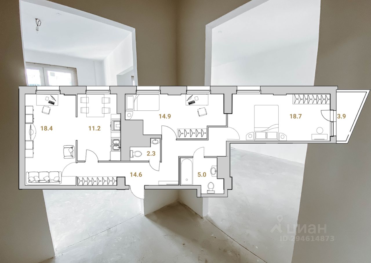 Кухня-столовая 11.2 кв.м. имеет выход в соседнюю комнату 18.4 кв.м. в которой удобно расположить гостиную с зоной для отдыха и приёма гостей. При желании кухню можно отделить от комнаты убрав проём в стене. Жилая комната 14.9 кв.м. порадует большой освещённостью за счёт двух окон. В комнате 18.7 кв.м. также светло, благодаря окну и балкону 3.9 кв. м. Прихожая 14.6 кв.м. с нишей под гардероб. Два санузла.