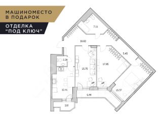 Кухня 12.4 кв.м. с выходом на остеклённый балкон 2.8 кв.м. Три жилые комнаты: 15.8 кв.м., 18 кв.м. и 15.6 кв.м. с общей лоджией 6.4 кв.м. Вместительная прихожая 22.1 кв.м. позволяет поставить большой гардероб. Два санузла: основной 7.1 кв.м. и гостевой 2.3 кв.м.